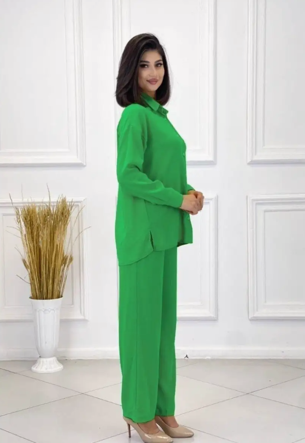 | Костюм льняной с прямыми широкими брюками палаццо и рубашкой зеленый | 42 |