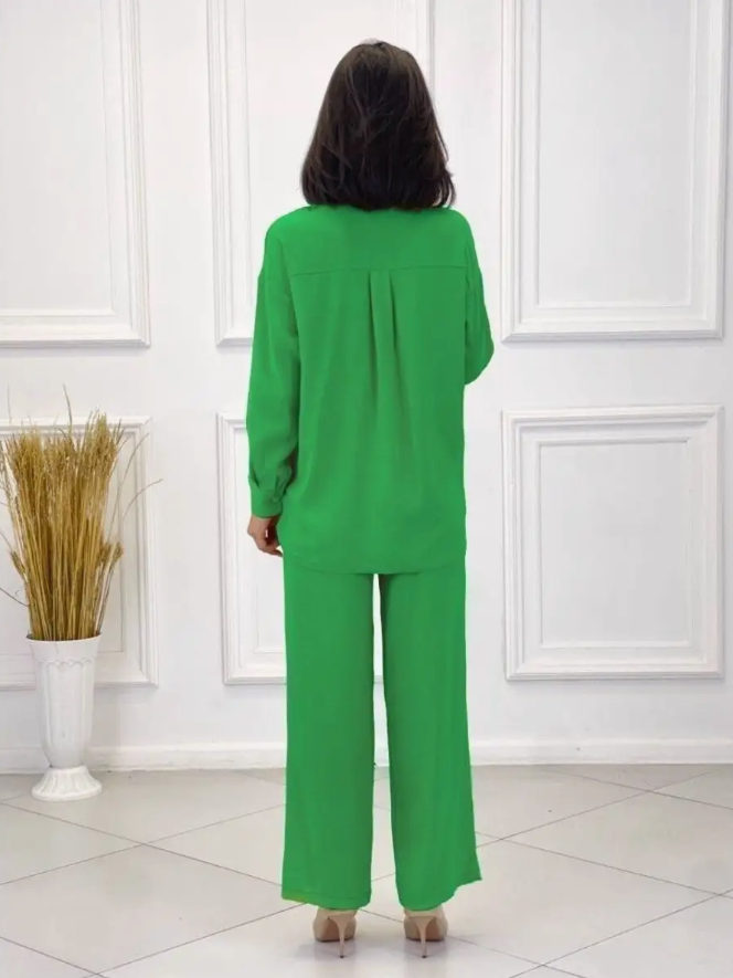 Костюм льняной с прямыми широкими брюками палаццо и рубашкой зеленый